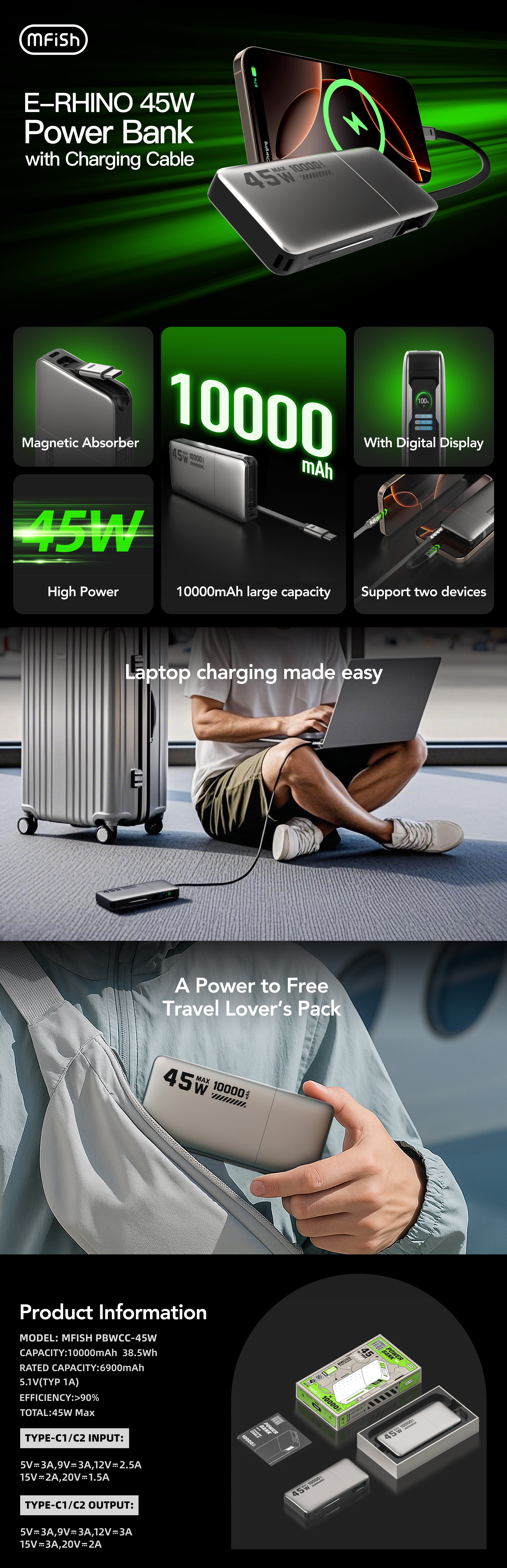 mfish E-RHINO 45W Power Bank – Retractable Cable | 10000mAh | Smart Display