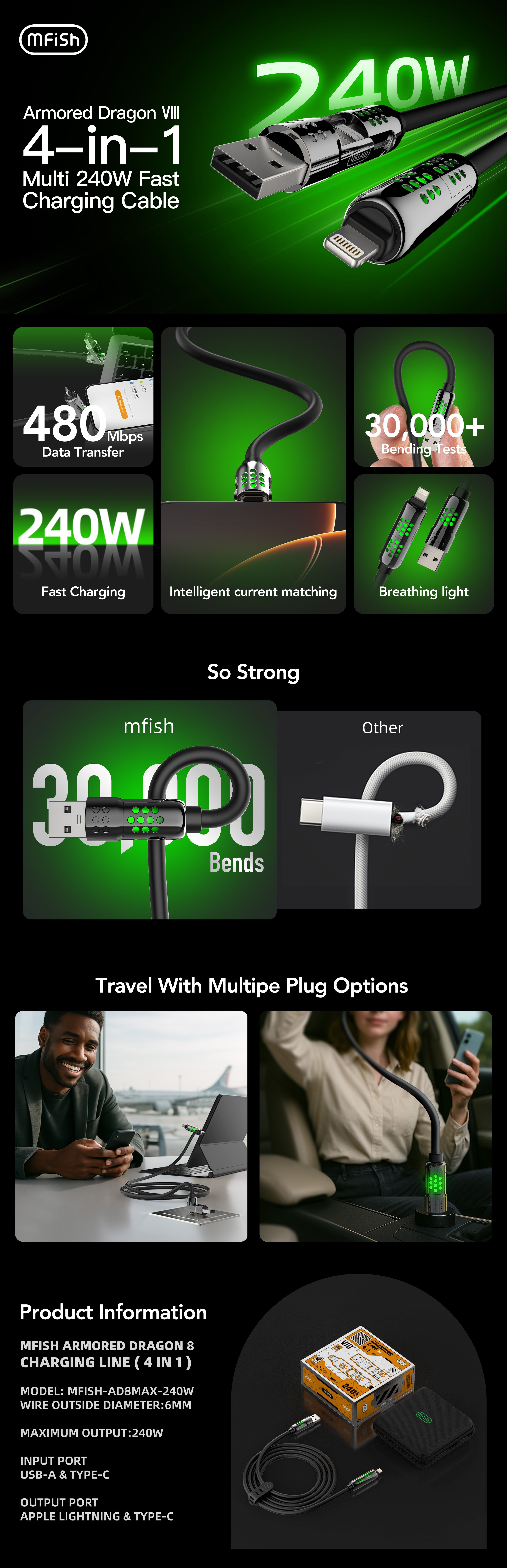 mfish Armored Dragon Ⅷ – 4-in-1 Charging Cable | 240W Fast Charge | Braided + Silicone | Breathing Light