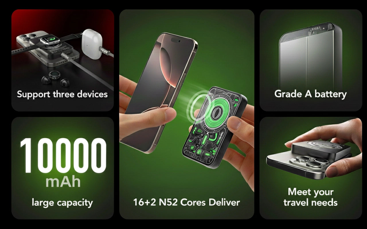 Charge up to 3 devices at once with the 10,000mAh capacity and ultra-strong N52 magnetic alignment.