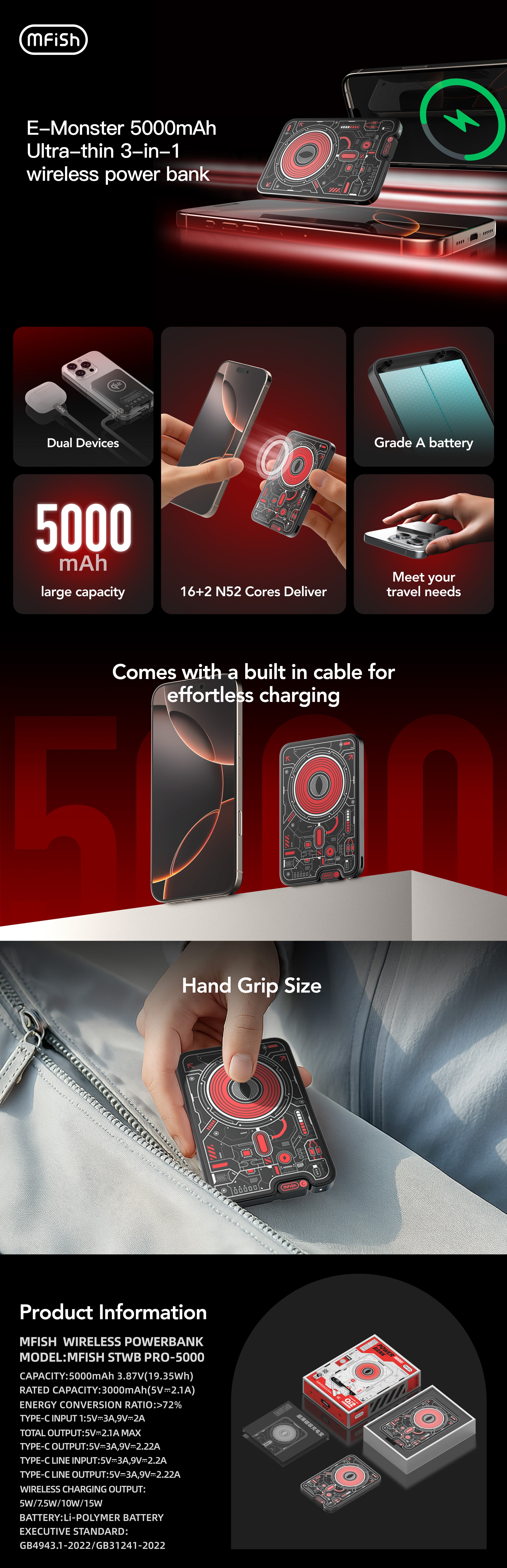 mfish E-Monster 5000mAh Ultra-Thin MagSafe Power Bank – 15W Wireless | 20W PD | Built-in Cable