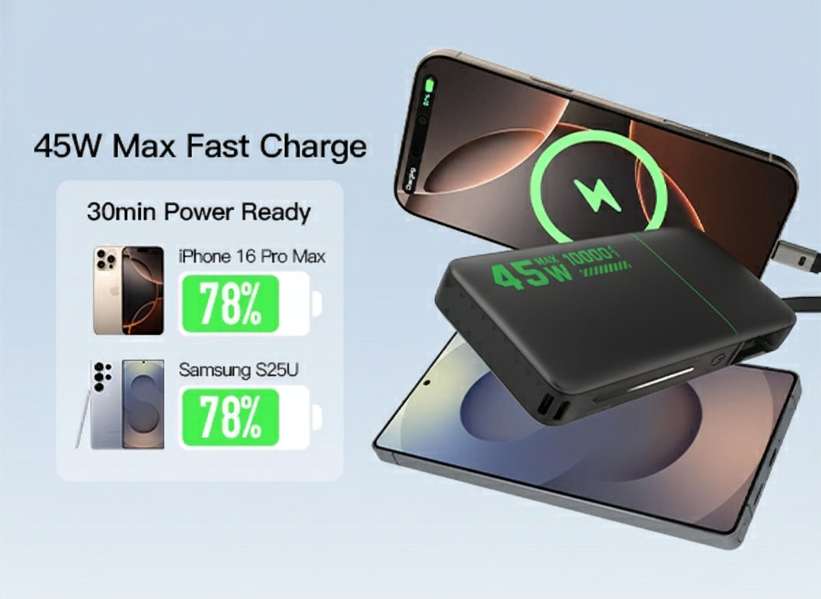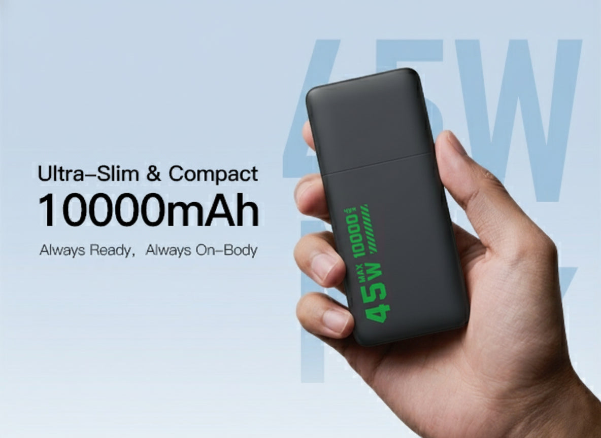 10,000mAh with 45W max output in a sleek, handheld design. Reliable backup wherever you go.