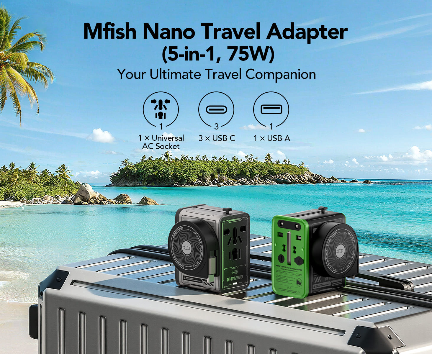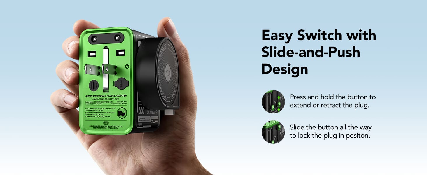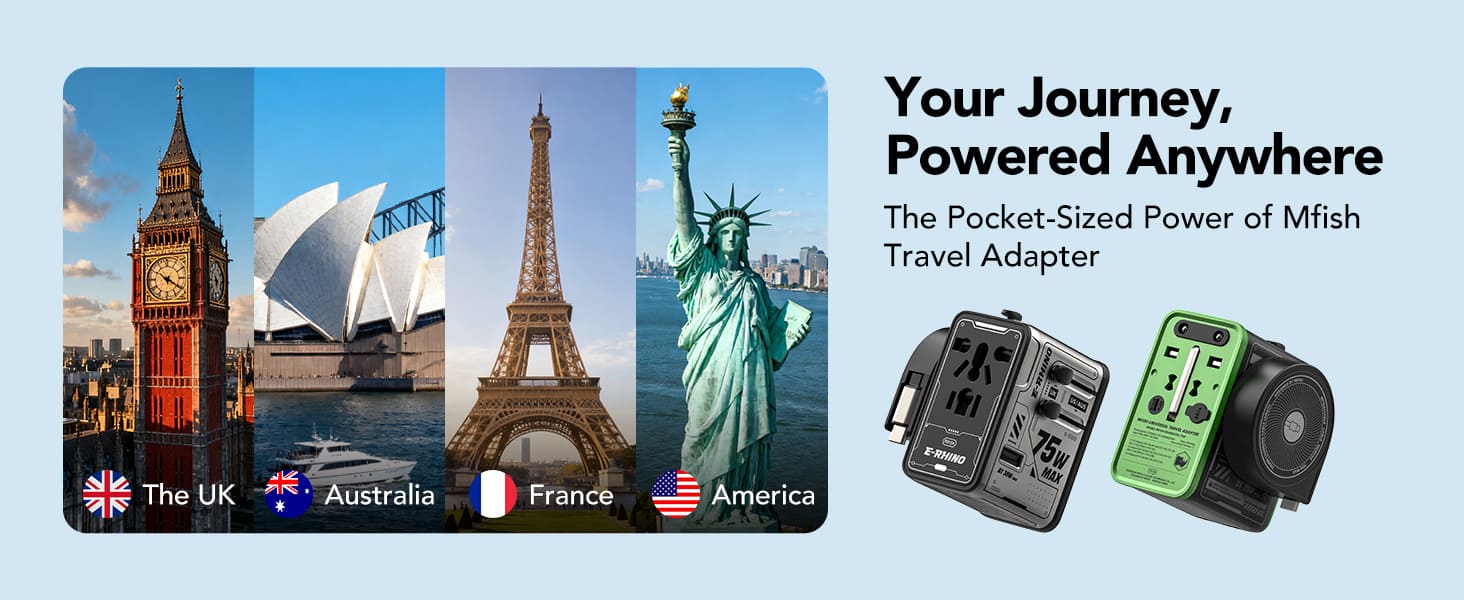 mfish E-RHINO Travel Adapter (75W, 5-in-1, GaN, Built-in Retractable Cable)