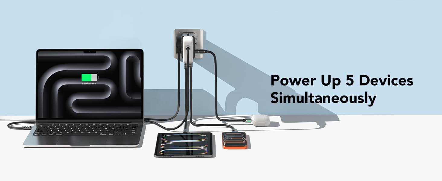 - Power 5 Devices at Once — Laptop + Phone, 75W total output.