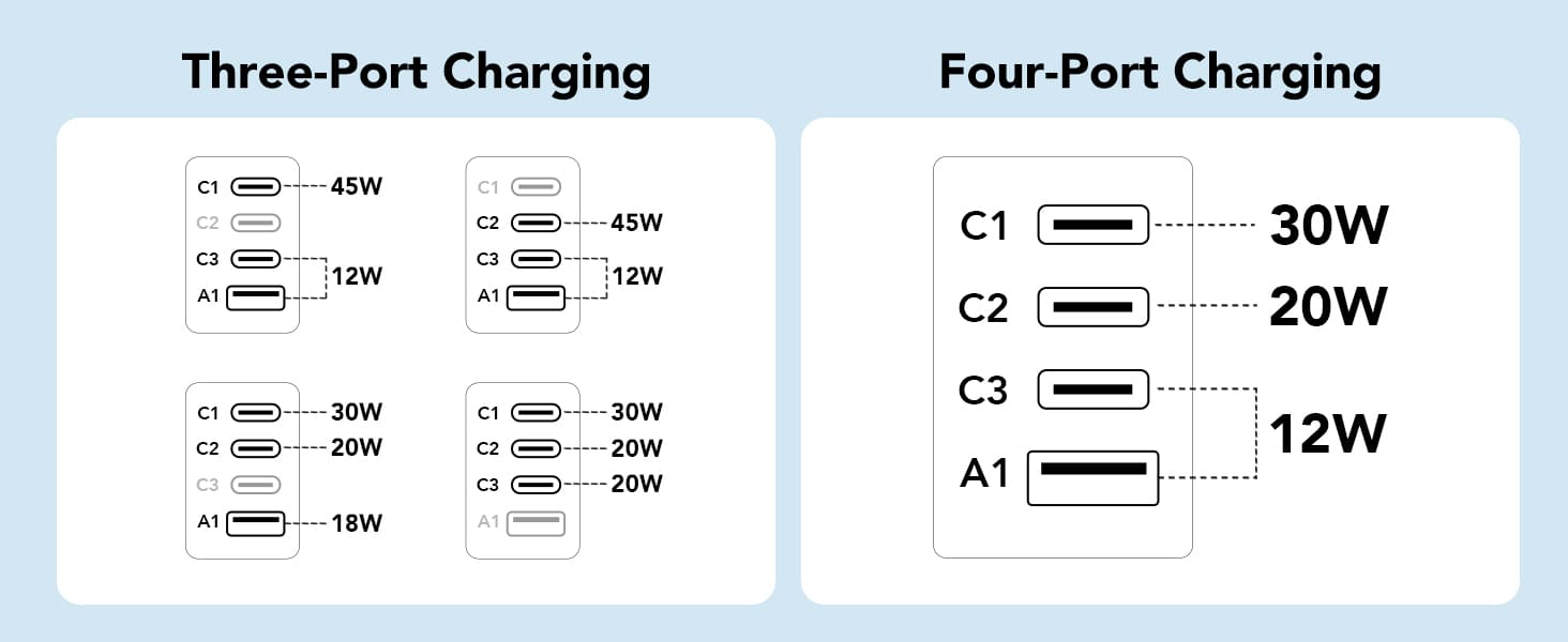 - Intelligent power distribution lets you charge multiple devices simultaneously