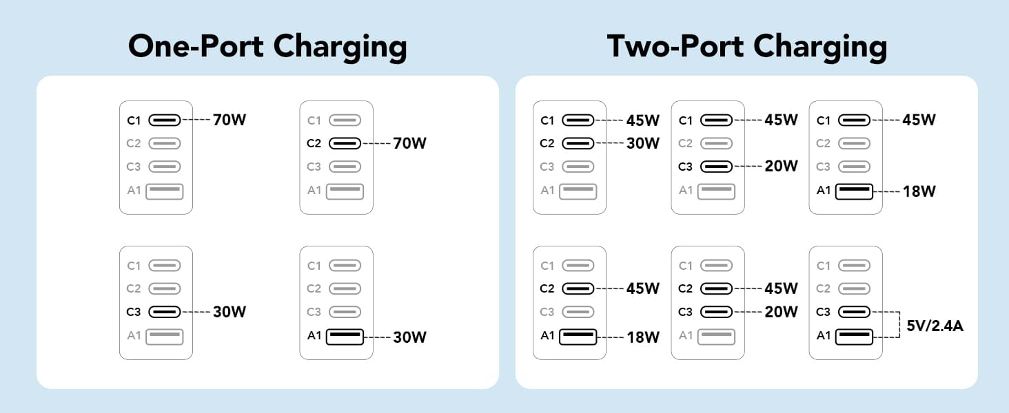 - Type-C1 or Type-C2 delivers up to 70W output individually