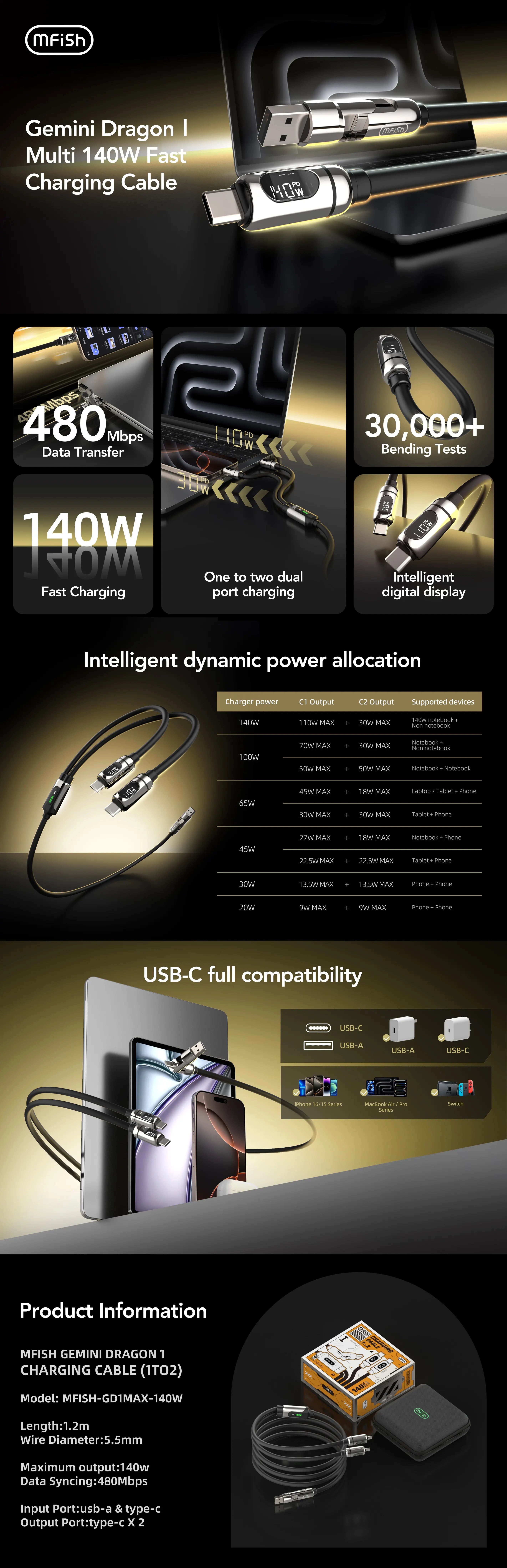 Meet the mfish Gemini Dragon — a dual Type-C powerhouse built for those who charge smarter, faster, and cleaner. With 140W Max output and real-time power monitoring, it’s the ultimate cable for your high-performance setup, whether at your desk or on the go.