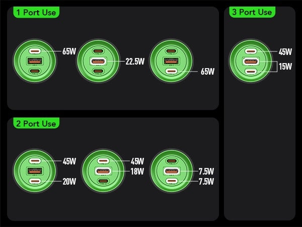 2 USB-C + 1 USB-A. Supports up to 65W output on single port, or intelligent distribution when multiple devices are connected. Fast-charge laptops, tablets, and phones at once.