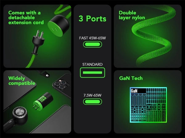 Advanced GaN Chip Technology: Integrated with 6th-gen GaN technology, this charger is designed to be more compact and efficient, generating less heat and reducing power consumption while providing reliable high-speed charging